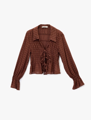 Fiyonklu Bağlama Detaylı Uzun Balon Kollu Gömlek Yaka Ekoseli Bluz