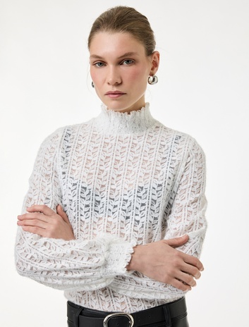 Uzun Balon Kollu Fırfırlı Dik Yaka Dantelli Bluz