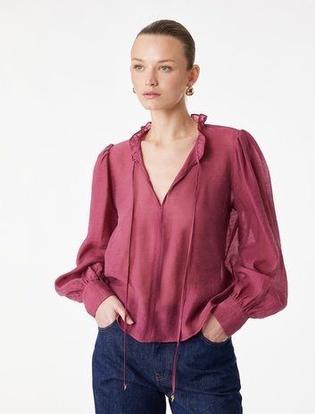 V Yaka Bağlama Detaylı Fiyonklu Balon Kol Fisto Bluz