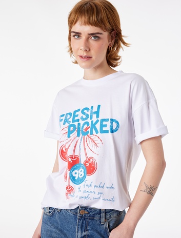 Rahat Kalıp Kısa Kollu Bisiklet Yaka Arkası Kiraz Baskılı Tişört Sepete Ekle