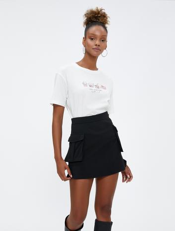 Crop Tişört Slogan Baskılı Bisiklet Yaka Dikiş Detaylı Pamuklu