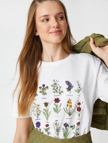 Çiçek Baskılı Tişört Bisiklet Yaka Kısa Kollu