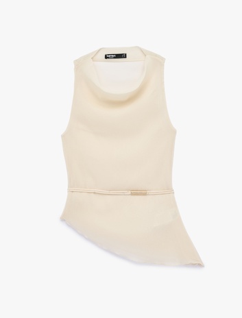 Kemer Detaylı Metal Aksesuarlı Kolsuz Asimetrik Degaje Yaka Bluz Sepete Ekle