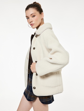 Dik Yaka Fermuar Cep Detaylı Çıtçıt Düğmeli Oversize Peluş Ceket