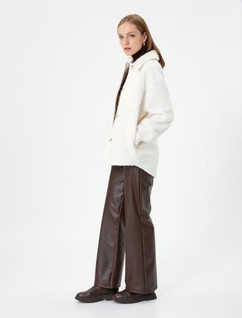 Dik Yaka Fermuar Cep Detaylı Çıtçıt Düğmeli Oversize Peluş Ceket Sepete Ekle