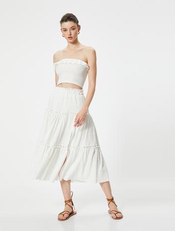Keten Karışımlı Katlı Dokulu Beli Bağlamalı Lastikli Midi Kloş Etek Sepete Ekle