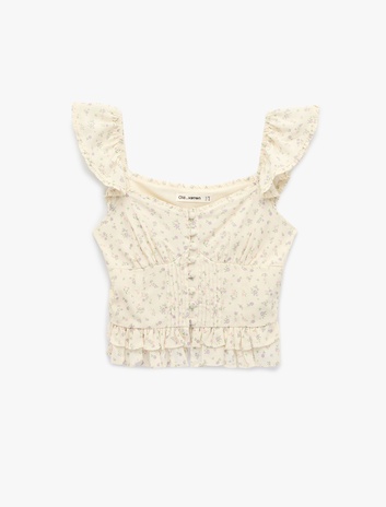 Slim Fit Kolsuz Düğmeli Fırfırlı Kalp Yaka Viskon Çiçekli Bluz Sepete Ekle