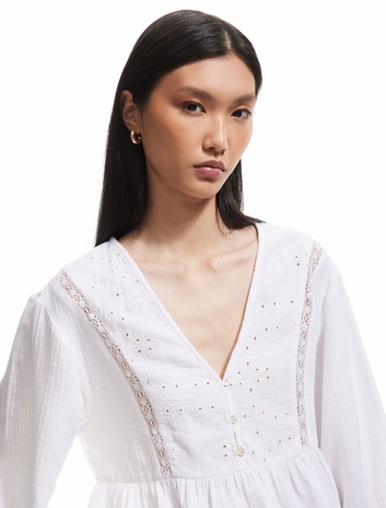 Pamuklu Bol Kalıp Nakış Detaylı V Yaka Fistolu Müslin Bluz Sepete Ekle