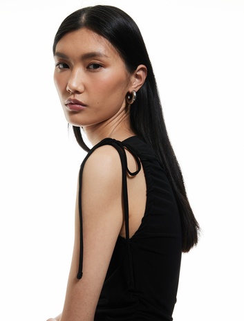 Drapeli Fiyonk Bağlama Detaylı Düz Yaka Kolsuz Body