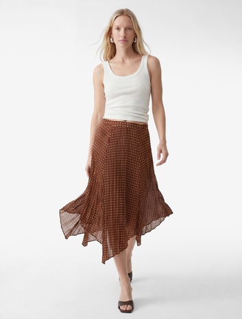 Puantiyeli Yüksek Bel Pileli Krep Kumaş Asimetrik Midi Etek Sepete Ekle