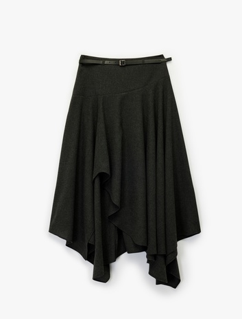 Asimetrik Uçlu Kemer Detaylı Volanlı Yün Karışımlı Kloş Midi Etek Sepete Ekle