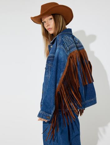 Nakışlı Kot Ceket Süet Görünümlü Püsküllü Cep Detaylı Düğmeli