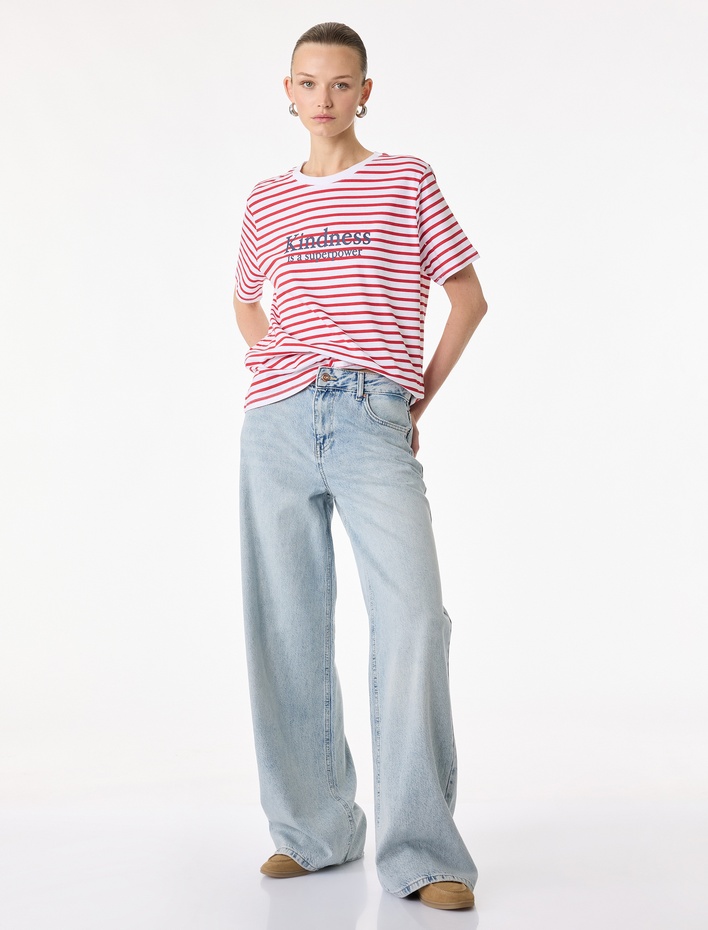 Bisiklet Yaka Kısa Kollu Pamuklu Baskılı Çizgili Tişört Sepete Ekle