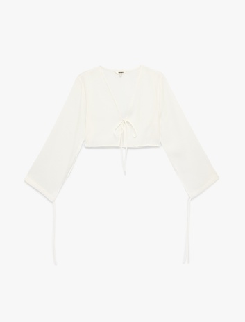 Modal Kumaş Bağlama Detaylı Uzun Geniş Kollu Crop Bluz Sepete Ekle