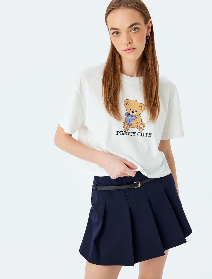 Ayı Baskılı Kısa Kollu Bisiklet Yaka Crop Tişört Sepete Ekle