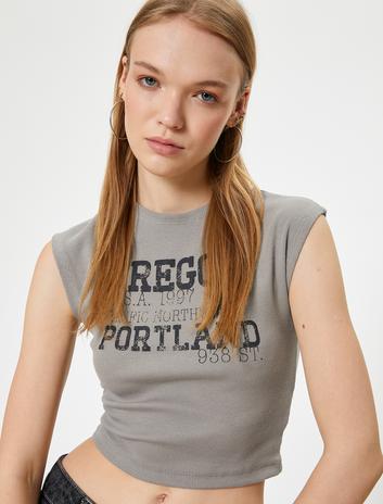 Metalik Varak Baskılı Crop Tişört Kolsuz Bisiklet Yaka