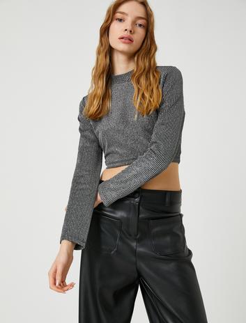 Uzun Kollu Tişört Crop Pencere Detaylı Bisiklet Yaka