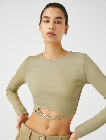 Uzun Kollu Tişört Crop Bisiklet Yaka Metal Aksesuarlı Sepete Ekle
