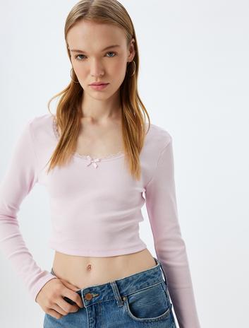 Crop Tişört Uzun Kollu Fiyonk Detaylı U Yaka Slim Fit Sepete Ekle