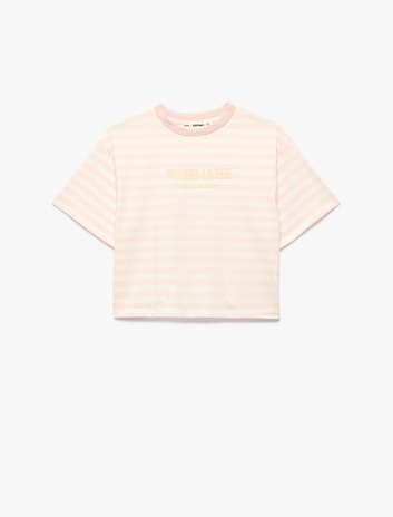 Kısa Kollu Bisiklet Yaka Rahat Kalıp Pamuklu Baskılı Çizgili Crop Tişört Sepete Ekle