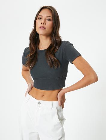 Crop Tişört Kısa Kollu Bisiklet Yaka Pamuklu