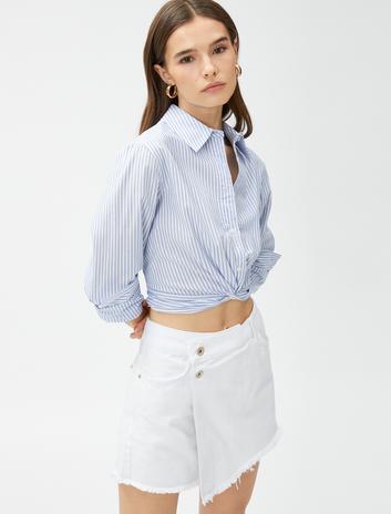 Crop Gömlek Düğüm Detaylı Uzun Kollu Pamuklu