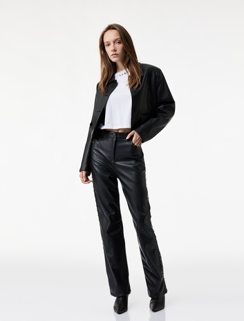 Koton X Sibil Çetinkaya - Cepli Düz Paça Suni Deri Pantolon