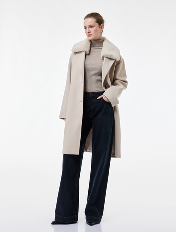 Koton X Şahika Ercümen - Suni Kürk Yaka Kaban Kaşe Kruvaze Kemerli Cepli