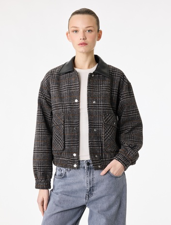 Düğmeli Cepli Suni Deri Yaka Detaylı Crop Ekose Bomber Ceket Sepete Ekle