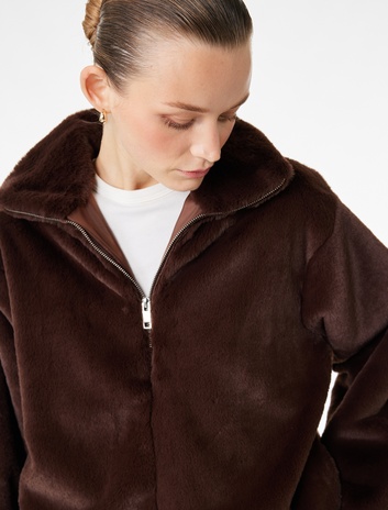 Uzun Kollu Dik Yaka Fermuarlı Suni Kürk Oversize Mont