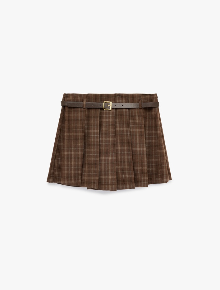 Viskon Karışımlı Kemer Detaylı Kalın Pileli Ekoseli Mini Etek