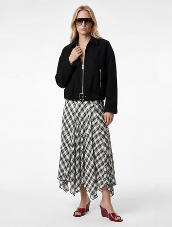 Yüksek Bel Kemerli Kloş Asimetrik Kesim Midi Ekoseli Etek