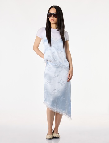 Asimetrik Kesim Dantel Detaylı Midi Kloş Saten Etek Sepete Ekle