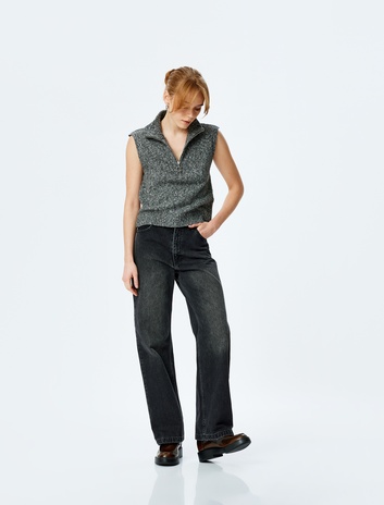 Yarım Fermuar Detaylı Dik Yaka Kolsuz Triko Süveter