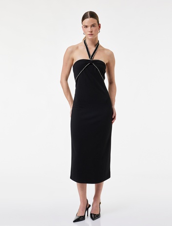 Boyundan Bağlamalı Midi Boy Taşlı Kadife Elbise