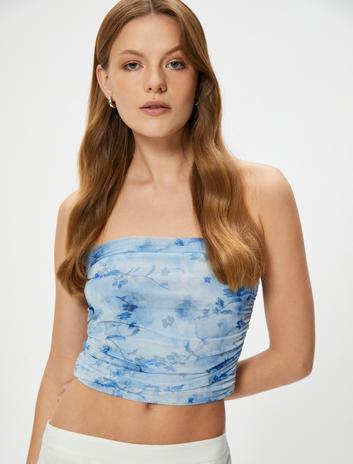 Çiçekli Tül Straplez Crop Üst Drapeli Slim Fit