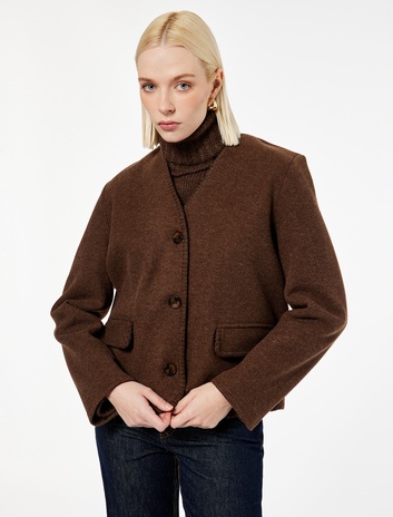 Çoban Dikişi Detaylı Düğmeli Uzun Kollu Cepli Kaşe Ceket
