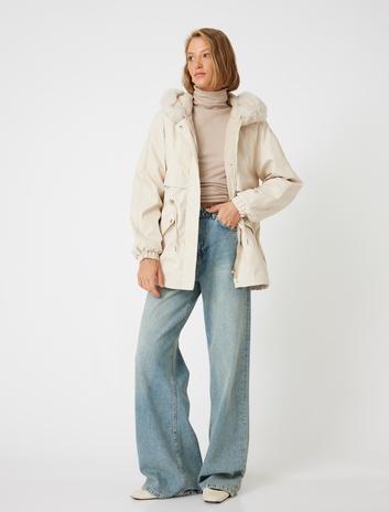 Suni Kürk Yaka Kapüşonlu Uzun Kaşe Kaban Cepli Metal Kapama Detaylı Sepete Ekle