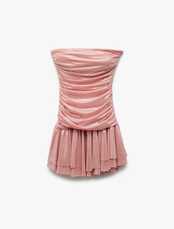 Drape Detaylı Kolsuz Straplez Volanlı Mini Abiye Elbise