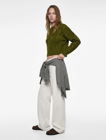 Uzun Kollu Gömlek Yaka Saç Örgü Dokulu Triko Kazak