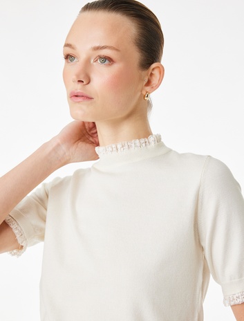 Koyun Yünü Karışımlı Kısa Kollu Dantel Detaylı Bisiklet Yaka Triko Kazak