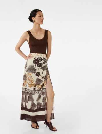 Viskon Keten Karışımlı Yırtmaç Detaylı Desenli Uzun Etek