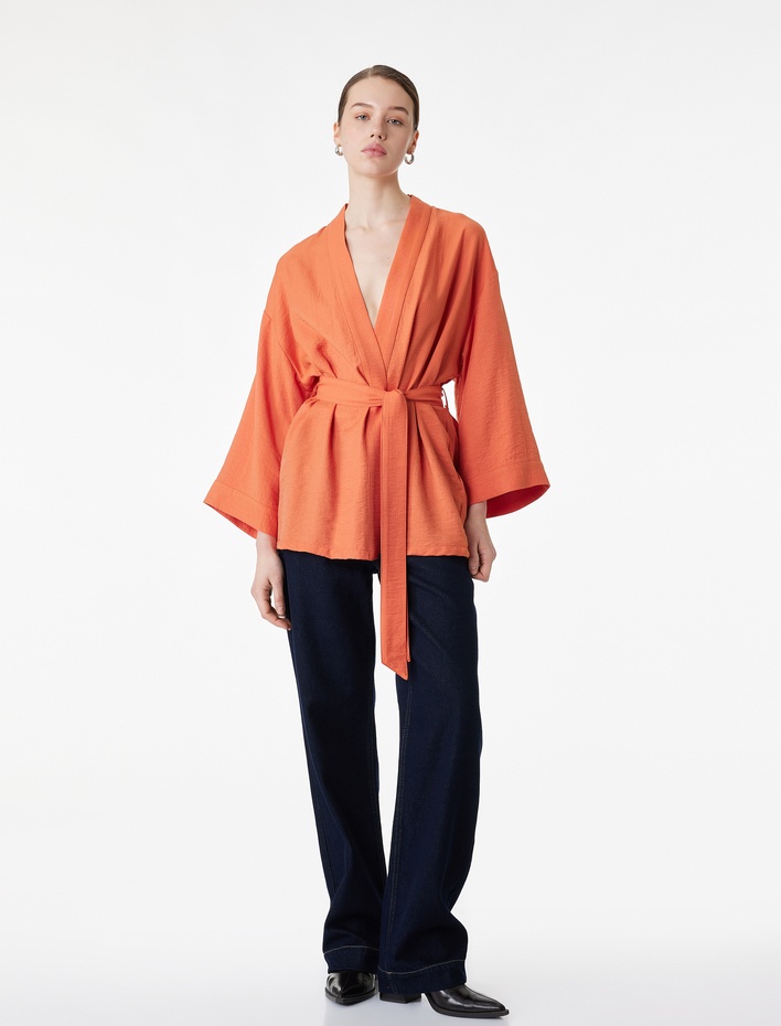 Viskon Kumaş Uzun Geniş Kol Kuşak Detaylı Kimono Sepete Ekle