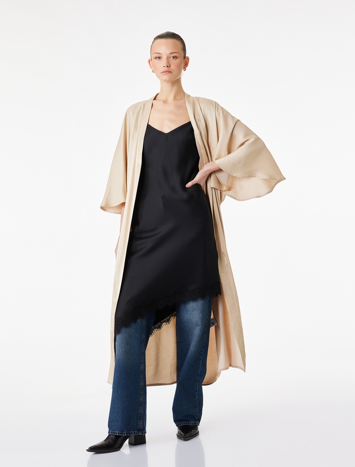 Rahat Kalıp Geniş Kol Uzun Saten Kimono Ceket Sepete Ekle