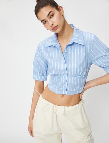 Crop Çizgili Gömlek Kısa Kollu Klasik Yaka Pamuklu