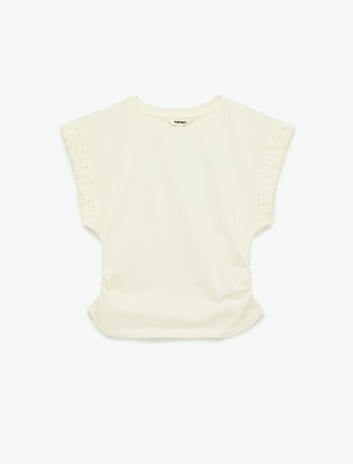 Pamuklu Kısa Kollu Bisiklet Yaka İnci İşleme Detaylı Tişört Sepete Ekle