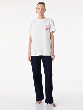 Pamuklu Kısa Kollu Bisiklet Yaka Arkası Kiraz Baskılı Tişört Sepete Ekle