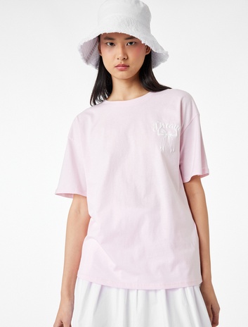 Rahat Kalıp Kısa Kollu Bisiklet Yaka Arkası Kiraz Baskılı Tişört Sepete Ekle