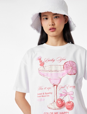Rahat Kalıp Kısa Kollu Bisiklet Yaka Baskılı Tişört Sepete Ekle