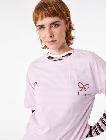 Arkası Baskılı Fiyonklu Rahat Kalıp Kısa Kollu Bisiklet Yaka Pamuklu Tişört Sepete Ekle